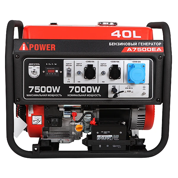 На передней панели бензогенератора A-iPower A7500EA расположены 2 евророзетки для подключения нетребовательных потребителей, а также силовая розетка 32А/230В, которая позволяет снять полную мощность с одного вывода. Все розетки оборудованы защитной автоматикой, которая отключает их в случае перегрузки.