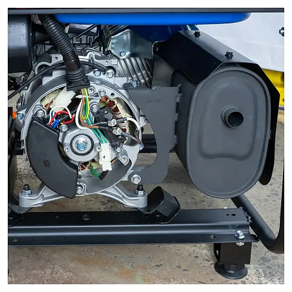 Бензиновый генератор имеет усиленную раму с надежным покрытием. Защищающим от коррозии. Модель оснащена 4- тактным двигателем с верхним расположением клапанов. Такая конструкция существенно снижает уровень теплонапряженности мотора, повышает его ресурс, снижает уровень шума во время работы и выхлоп. Запускается мотор вручную или при помощи электростартера, имеется опция автозапуска.