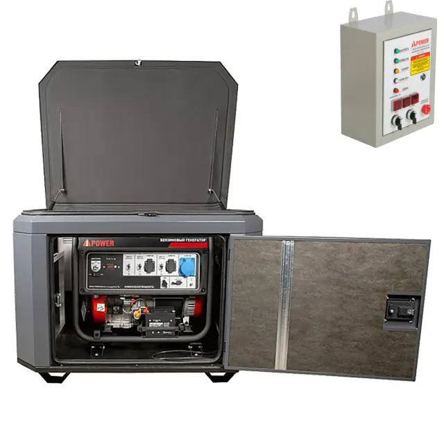 Бензиновый генератор A-iPower A8000EAX в тихом зимнем кожухе 1200 + блок автозапуска A-iPower 400 В, 25 А - надежный источник питания мощностью 7.5 кВт. Главные преимущества модели - до 10 часов работы на одном баке топлива и возможность подключения высоко индуктивных приборов с пусковой мощностью до 15 кВA.
