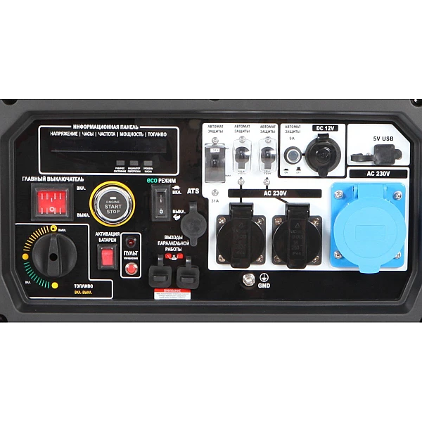 На передней панели расположены силовой вывод 32А, 2 стандартные евророзетки, USB-порт для зарядки мобильных гаджетов и розетка автомобильного формата 12В.