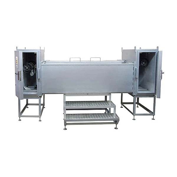 Защитная камера выполнена из стали и свинца, поставляется в разборном виде и монтируется на месте. Используется при промышленной дефектоскопии в стационарных условиях.