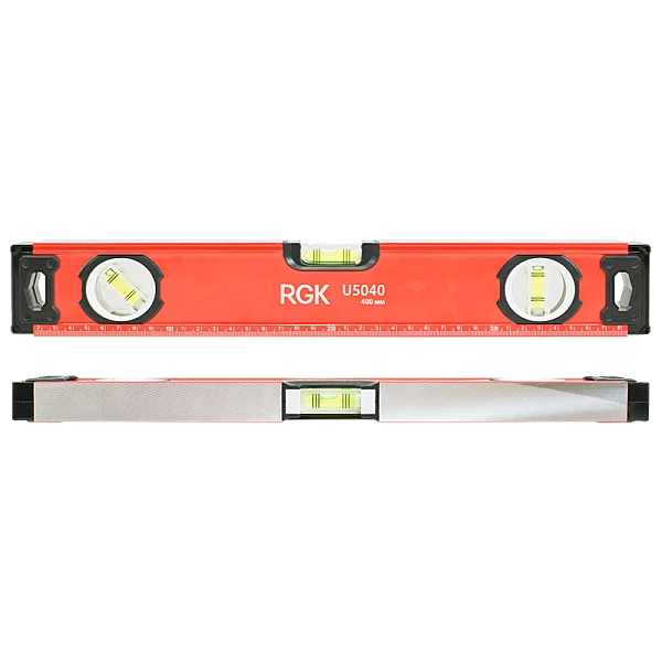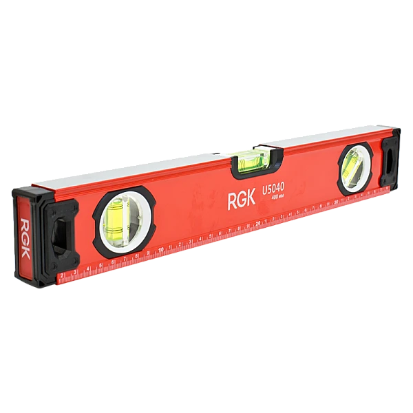 Строительный уровень RGK U5040 длиной 40 сантиметров оснащен двумя магнитами на противоположных сторонах для крепления уровня на металлической поверхности, чтобы освободить руки при проведении разметки.