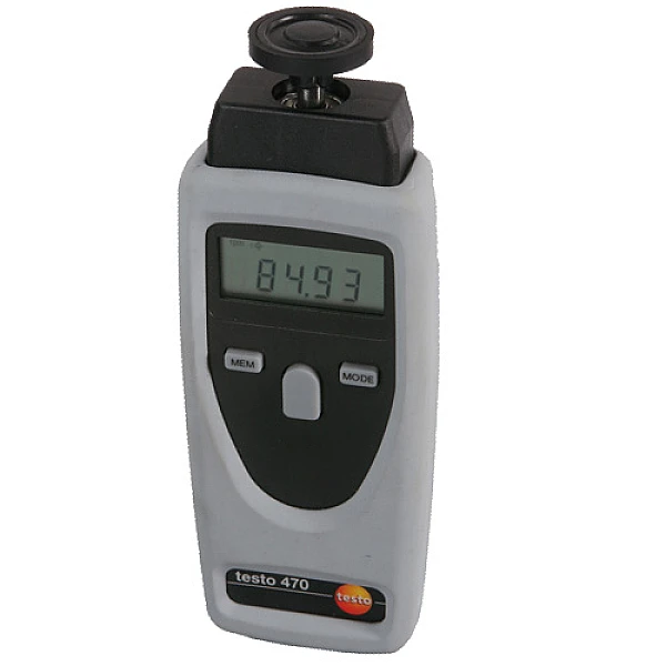 Тахометр Testo 470 служит как для оптического, так и для контактного измерения скорости вращения подвижных деталей различных механизмов. Для контактного механического измерения какого-либо элемента достаточно подключить к тахометру дисковый зонд. Измерения бесконтактным оптическим методом производятся с помощью светоотражающей ленты-рефлектора, которая крепится на объект измерения. С помощью лазерного указателя Testo 470 наводится на рефлектор, и аппарат считывает скорость вращения.