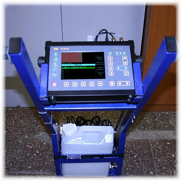 Установка контроля состоит из ультразвукового многоканального дефектоскопа УСД-60-8К и механической части на которой установлен акустический 16-ти элементный блок ультразвуковых преобразователей, 32-х канальный коммутатор и система подачи акустической жидкости.