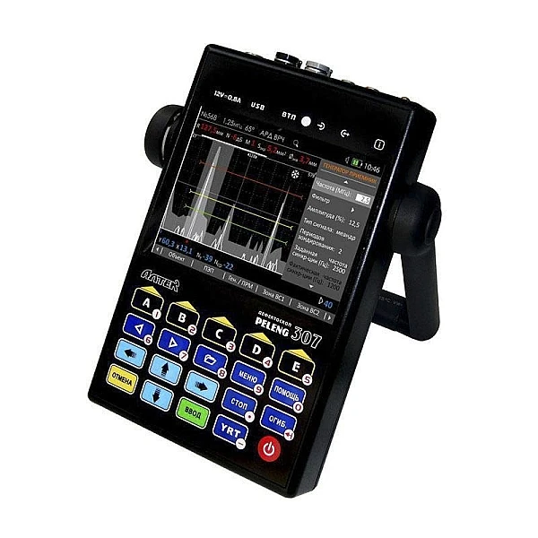 Ультразвуковой дефектоскоп Пеленг УД3-307ВД - новейшая разработка PELENG с улучшенным интуитивным интерфейсом работает с отечественными и зарубежными преобразователями. PELENG УД3-307ВД объединяет 3 устройства в одном: ультразвуковой дефектоскоп, ультразвуковой толщиномер и вихретоковый дефектоскоп. А-развертка. В-развертка (визуализация контролируемого сечения). W-развертка (изображение хода лучей с указанием мест расположения дефектов).